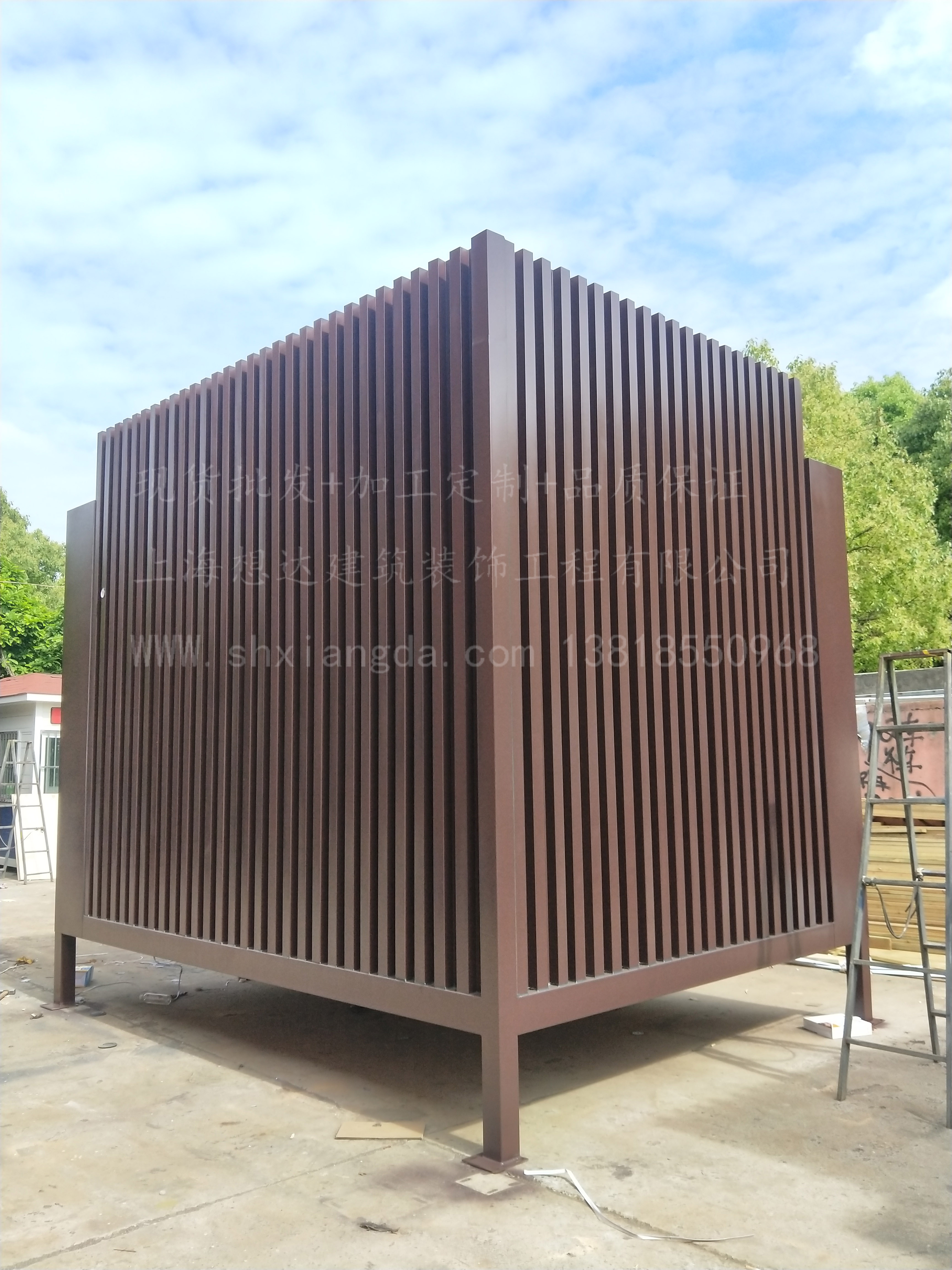 立柱采用100*100*2.5d鍍鋅方管焊接而成,整體鋼結(jié)構(gòu)骨架,抗震防風。外墻采用鍍鋅板折邊成型,內(nèi)搭3mm鋁塑板,吊頂為16mm金屬烤漆雕花板吊頂。
